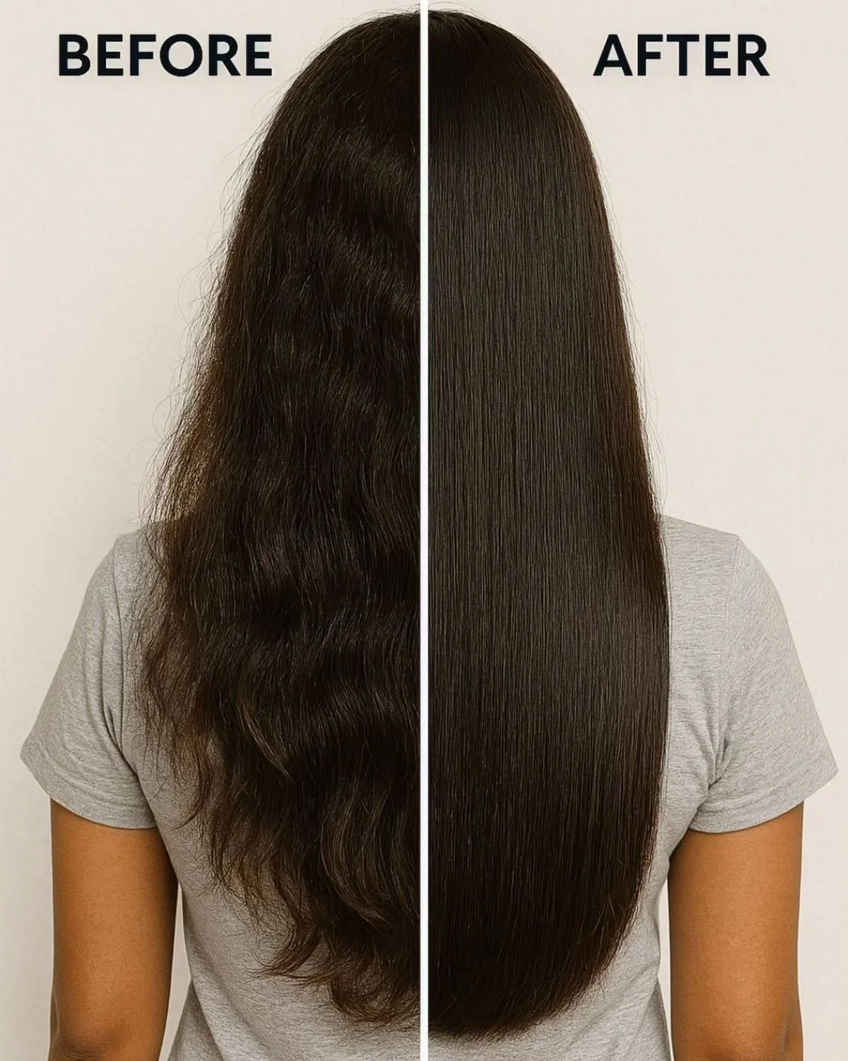 It’s considered a next-generation alternative to keratin treatments — offering similar smoothing and shine results but without harsh chemicals or strong fumes.